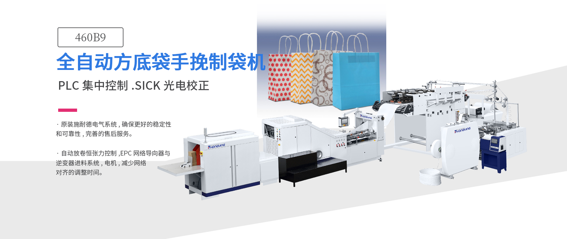 全自動手提紙袋機以其優異的品質和性能獲得了全世界用戶的認可。本機用于生產帶手提把的方底紙袋,是由手挽機將卷繩和貼片卷筒紙制成手把,通過輸送裝置將手挽送至貼把機組,貼把機組將原色或印刷好的卷筒紙進行貼片位點斷、貼片位涂膠、自動粘貼手把,再由主機將貼有手把的紙張進行涂邊膠、成紙筒、切斷、底部壓痕、底部涂膠、袋底成形并輸送出袋,整個制袋過程一次同步完成。是生產手提
